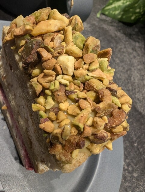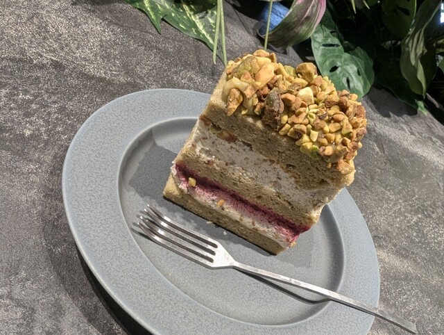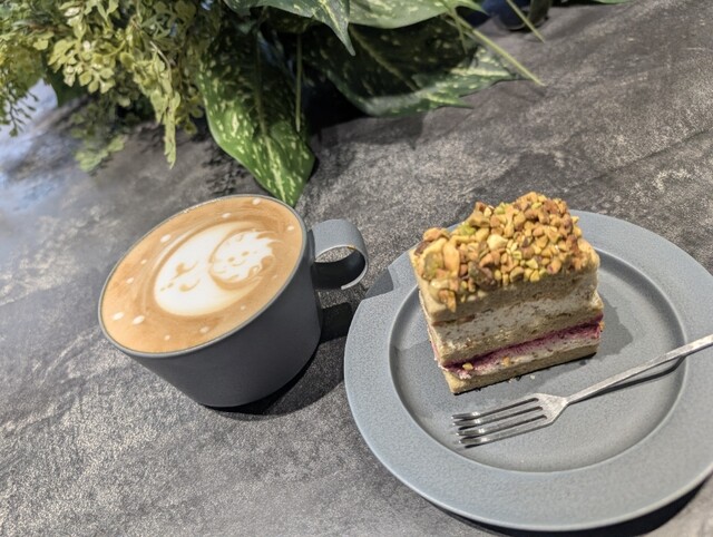 ナッツ贅沢ザクザクのピスタチオフランボワーズケーキ&カフェラテ