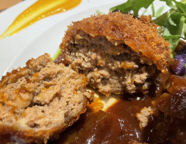 ◆メインは、ビーフシチューとメンチカツのコラボレーション。共に筑波山麓で育てられた飯村牛で作られています。ビーフシチューは、箸ですっと切れ、噛む必要がないほど、トロトロに煮込まれてます。メンチカツは牛肉がびっしり詰まった濃厚な味わい。とっても美味しかったです。