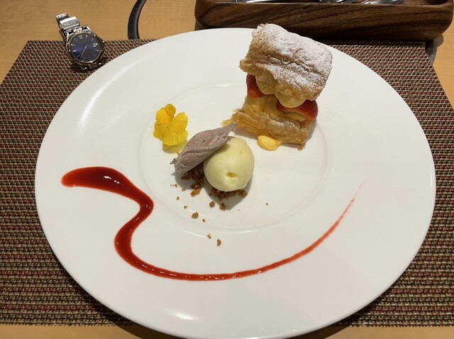 ◆デザートは、イチゴのミルフィーユとレモンのシャーベット。ミルフィーユは、カスタードクリームがたっぷり入って、イチゴの酸味、さくさくのシュー生地ともよく合います。レモンのシャーベットは爽やかな味で食事の締めくくりにぴったりでした。