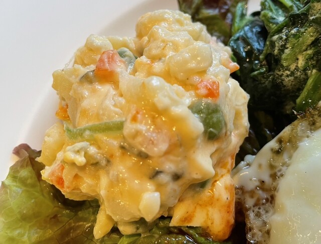 ◆ハンバーグは柔らかくてジューシーで、玉子との相性もぴったり。付け合わせは、ポテトサラダ、ほうれん草のソテー、ニンジンのグラッセが、どれもたっぷりの量で満足できます。ニンジンのグラッセは上品な甘み。