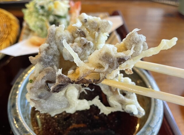 ◆まずはお蕎麦。阪東市のソメノファームが栽培した常陸秋そばだけを使っているとのこと。天もりそばの食べ方」に従い、まずは温かいつけ汁でにつけて噛まずに一気に飲み込みました。コシがある細麺で喉越しがよく美味しいお蕎麦です。次にカラ汁(冷たいつけ汁)でいただきます。カラ汁は枕崎産の本節だけを使った出汁、国産の材料で作った本醸造醤油などで作られていて、いい味。