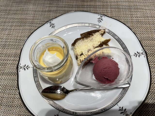 ◆デザート盛合せは、滑らかプリン、ティラミス、赤葡萄のシャーベットの3種。滑らかプリンは、文字通り滑らかで、甘さ控えめなので卵の味を感じる。ティラミスはクリーミーで濃厚。シャーベットは爽やかな味でした。