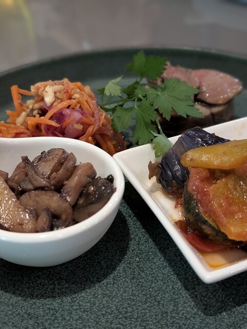 前菜のオードブル盛りはきのこのバルサミコソテー、ぶどうとりんごのキャロットラペ、カポナータ、レバーと豚ヒレのヨッシーニ風。