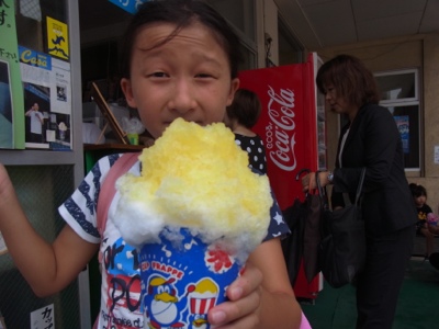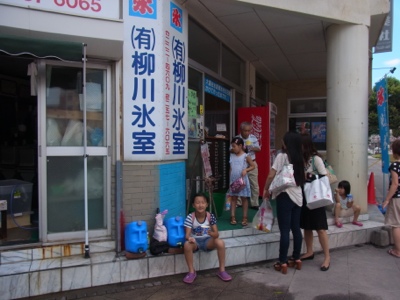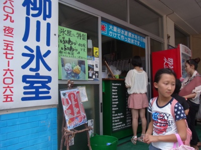 氷屋さんがカキ氷を小売販売しています。