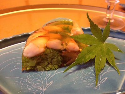 前菜は「海老とブロッコリーのゼリーよせ」だそうです。
