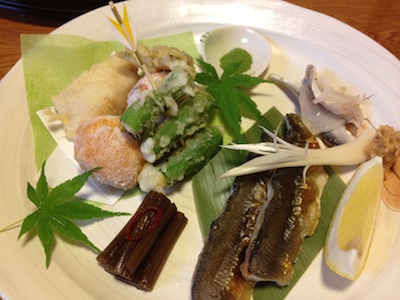 メインディッシュの揚げ物は「海老しんじょう」魚は「鮎」と説明頂きました。