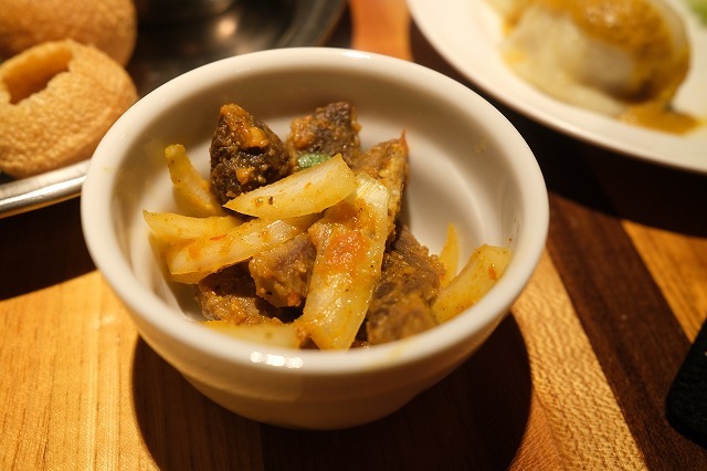 スクティというマトンの干し肉をトマトとスパイスと炒めたものと、チキン・チリビギナーという鶏肉のスパイシー炒め。