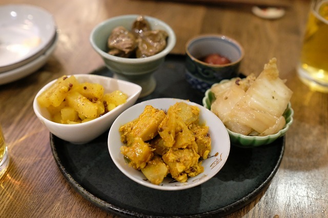 新大根の浅漬け、鶏ハツのアチャール、ミニトマトの南蛮漬け、季節野菜のおひたし、そして、蓮根とココナッツの和え物(?)。