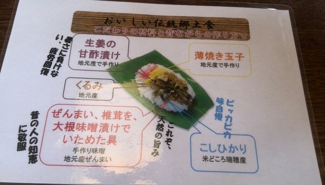 地元で採った笹の上に、米どころ飯山市瑞穂産のコシヒカリともち米の酢飯、その上に生姜の甘酢漬け、薄焼き玉子、くるみ、ぜんまいと干椎茸を大根味噌漬で炒めた具を綺麗に並べてあります。