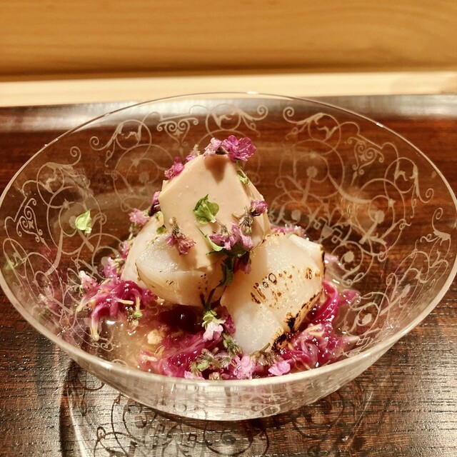 恒例の煮えばなは、キャビアと花山椒で頂きます。まだ鳥貝の季節には早く、蛤と北寄貝しゃぶって濃いめのお出汁と肝のソースで頂くものも、優しいお味で美味しいです。