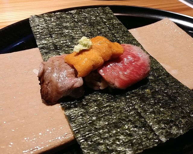 軽く炙った山形牛サーロインに生雲丹を載せ、大きめの海苔で手巻き。
