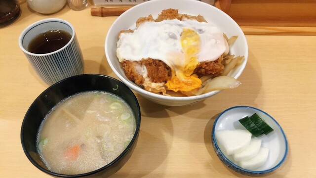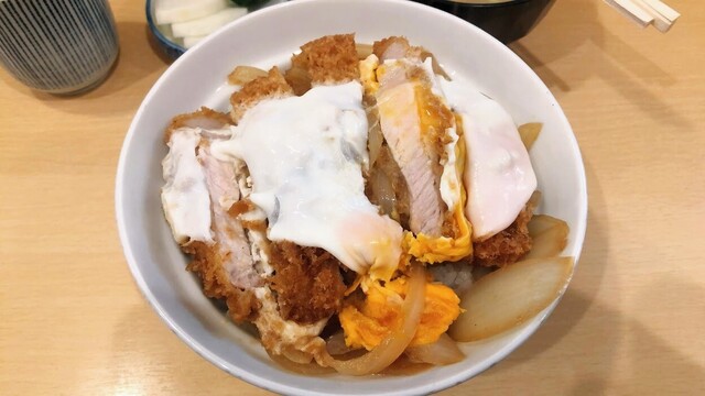 とじないカツ丼がとんかつのサクサクのまま 上に卵がとじてあって 玉ねぎのじゅたんの下には甘すぎず 濃すぎない優しい割り下の沁みたご飯 個人的にロースはリブ側が好きなので赤身はやや寂しいが