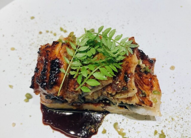 カラメルの乗ったフォアグラに 鰻を乗せて
