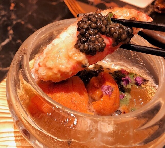 ミネラルたっぷりなかづの牛は海風を浴びた稲を食べて、唯一放牧されている和牛をカリフラワ ームース、魚介っぽいコンソメ、昆布たっぷり食べた雲丹でミネラル豊富(ミネラル×ミネラル)