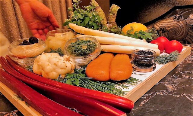 うどを乳酸発酵させた汁に醤油を足した自家製ぽん酢、サワークリームとココナッツを煮詰めたソース、生卵巣(赤)生精巣(白)メスの卵巣とオスの白子、生で食べられるのは生のみ
