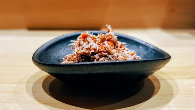 香箱蟹 蟹身に内子外子を混ぜたものをびっしり これだけで日本酒2合はイケるんじゃない・・・この前富山で食べて以来 大将蟹とか北陸のものを出してくれる ご出身は長野だとおっしゃっていたが長野と北陸はご縁が結構あるからね