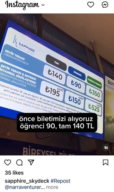 例えば、私がイスタンブールに行く度に訪れている展望デッキは、2019年は38TLだったのに、今年は350TL