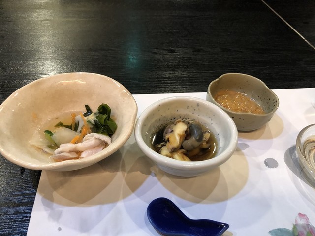 某日いただいたのは、先付、刺し盛り、穴子白焼き、蛤酒蒸し、芽キャベツ天麩羅、ナマコ酢。
