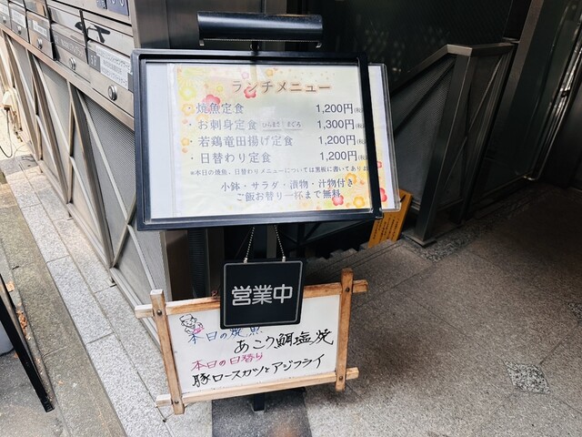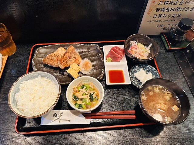 ランチメニューは、焼魚定食、お刺身定食、若鶏竜田揚げ定食、日替わり定食。