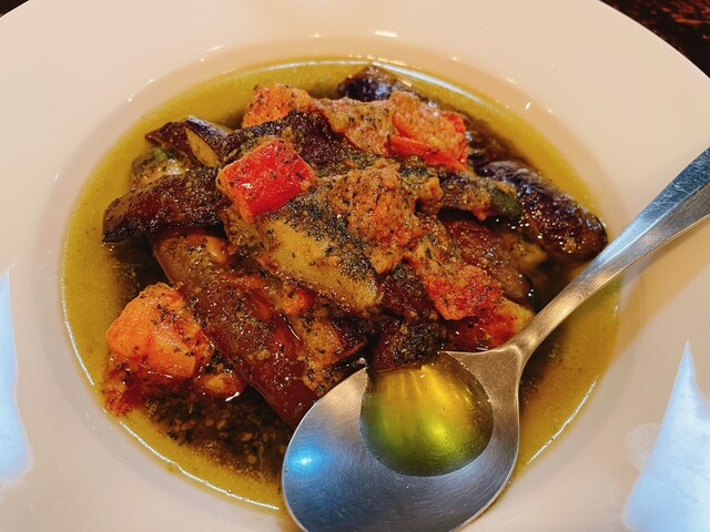 北海蛸、ジャガイモ、マッシュルームのちぢみほうれん草ジュノベーゼ焼き、