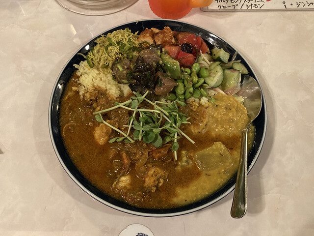 プレートの内容は、ソフトシェルクラブとアオサの冷しカレー、冬瓜のダール、スパイスポキ、ちくわとオクラのスパイスキムチ、茗荷ときゅうりのさっぱりアチャール、シラスとピーマンのスパイス炒め、ガーリッククミン枝豆、トマトとベリーのスパイスサラダ。