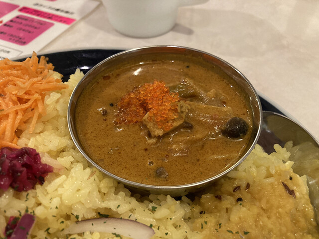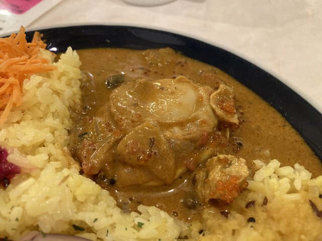 飯田橋No.1ホタテとキノコのココナッツカリ〜(とび子添え)+粗挽きキーマカリ〜!