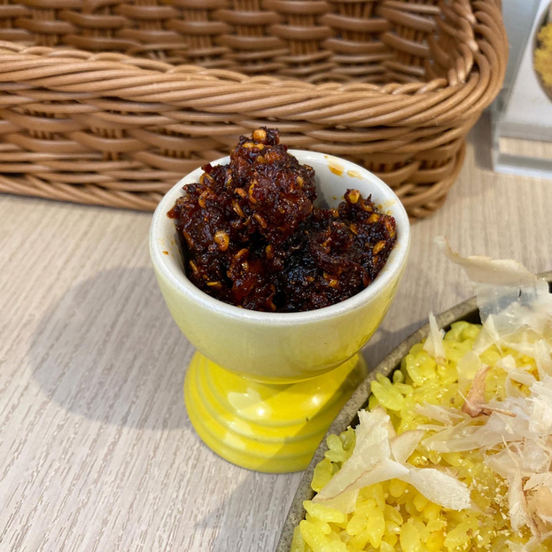 ライス上に振りかけられたエビもスパイシーで汗だく!!!