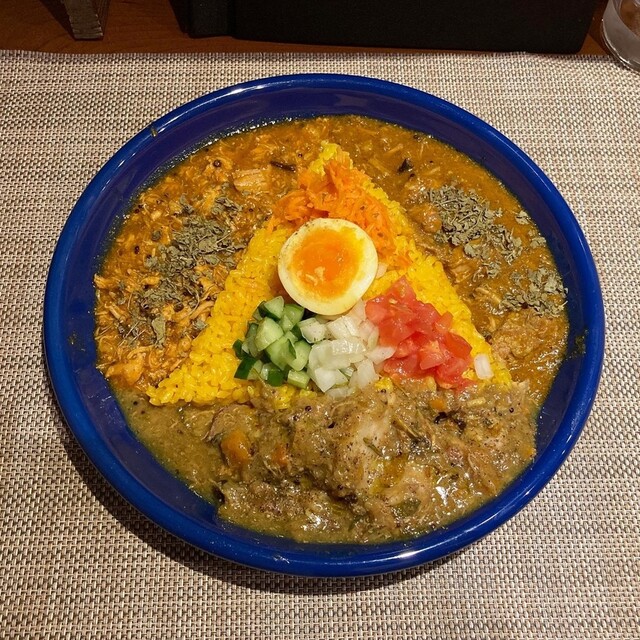両国No.1イタリア産赤ワインヴィネガーとマトンポークのココナッツビンダル+花椒と昆布マトンチキンの肉味噌キーマカレーのトミプレート大盛り!