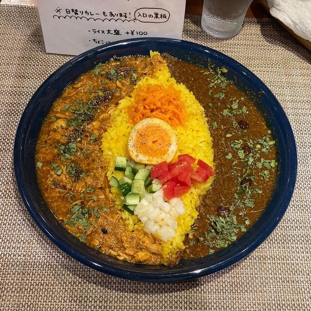 両国No.1スパイスキーマカレー青とうがらしとチキンの白ワインラグーカレー+真鯛の出汁のシーフードカレー+フライドオニオン+セロリペースト+α!