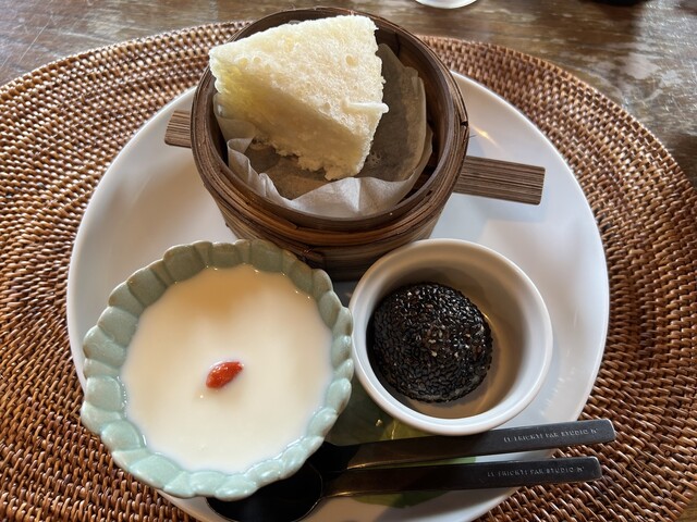 ココナッツの蒸しパン、杏仁豆腐、黒ごま団子。