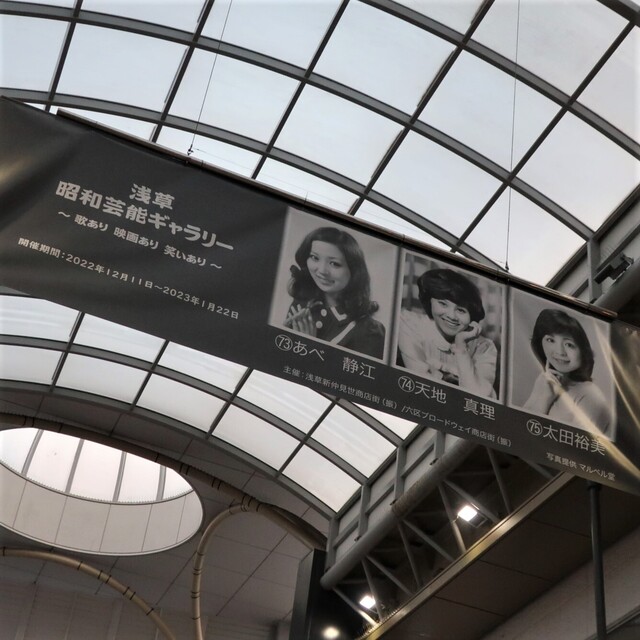 ただ今、新仲見世通りの屋根には昭和のアイドルや芸能人の写真が飾られ、懐メロが流れています。