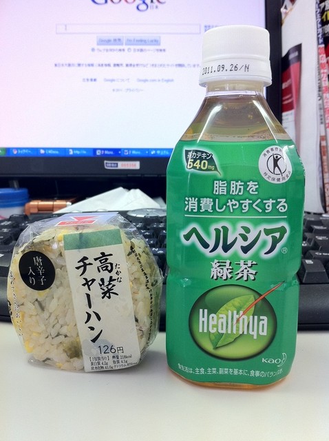 ヘルシアと高菜炒飯おにぎり