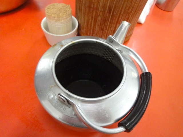ふたの開いたアルミの急須がある。