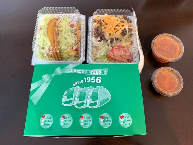 お店で食べるつもりで来たのですが、お客さん多すぎでなんかゆっくり食べれなそうなのと、待ってる人に見られながら食事をするのもどうかなぁと思いテイクアウトに変更。タコスとチャーリーライス(小)を購入。持ち帰って家でゆっくり食べることにしました。