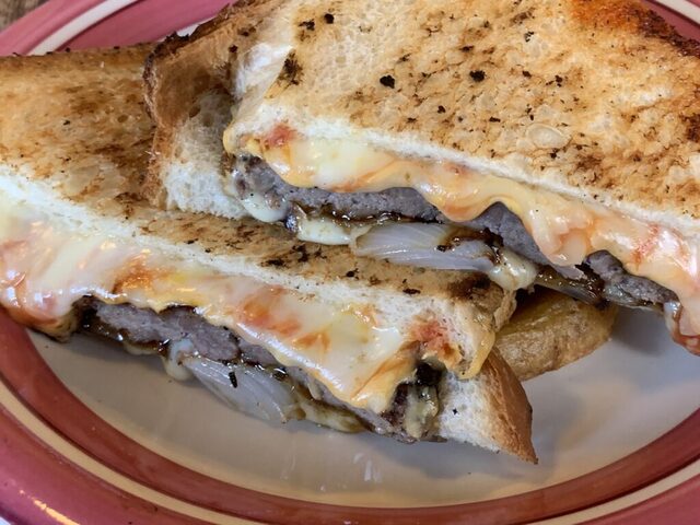 ちょっとアップで撮影。チーズとパティ、焦げ目のついたトーストうーん最高。