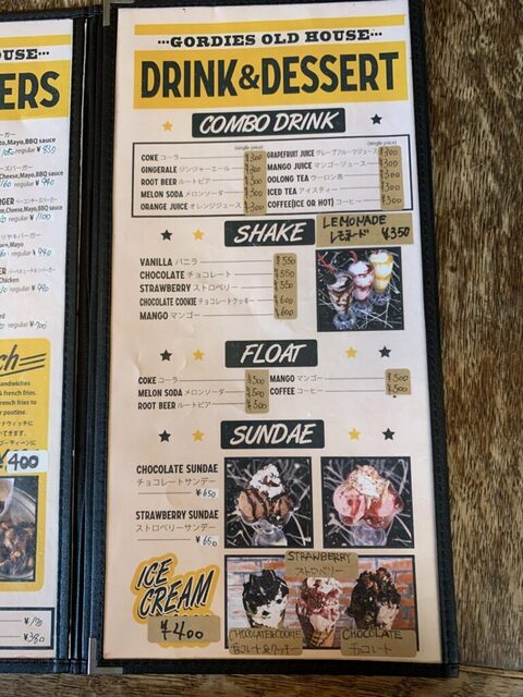 58号沿い嘉手納にあるゴーディーズオールドハウス北谷のゴーディスが有名ですがうちはこっちに行く事が多いですかね。家から近いのもありますがお店の雰囲気はこっちの方が好きかなぁ。観光客もそれほど多くはないですしお店の雰囲気も素敵です。こういうアンティークなアメリカを感じられるお店好きです。北谷との違いはバーガー種類とこっちにはサンドウィッチがあることかなぁ。