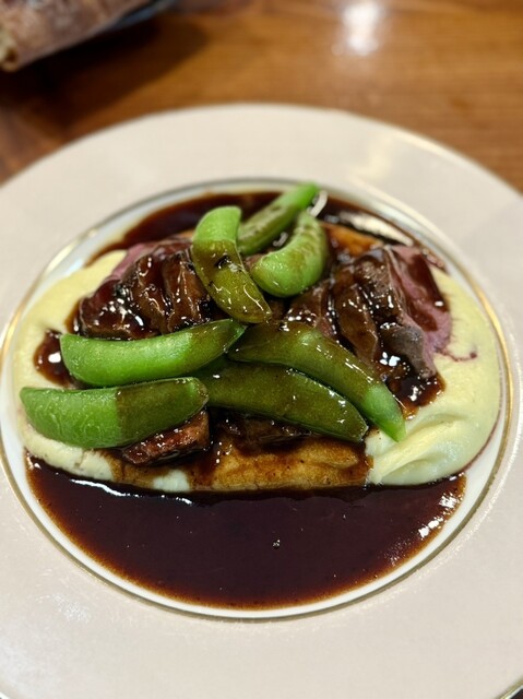 エゾ鹿のロティのお肉は全く臭みがなく、柔らかい、ソースは主張しすぎない程度にトリュフが使われており、とても美味しかったです。つけ合わせのマッシュポテトが最高すぎます。