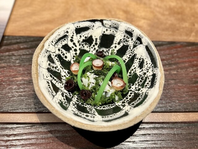 岩礁の中には3種類のお料理があり、昆布の串に刺さったウニボールが絶品でした。磯の香りが豊かで、口に入れるとウニが口の中で広がる逸品です✨