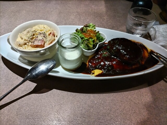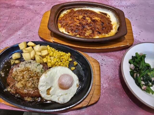 ミラノ風ドリアとほうれん草のソテーそしてディアボラ風ハンバーグ