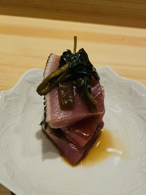 最初に供されたのは、京都・宮津のメジマグロと葉わさび。ツマミにこそ、美味いものを出したいという気概とこだわりが詰まっている。皮はパリッと香ばしく、中からジューシーな旨みがあふれ出す。これから始まる一連の料理への期待を抱かせる、見事な一皿だった。