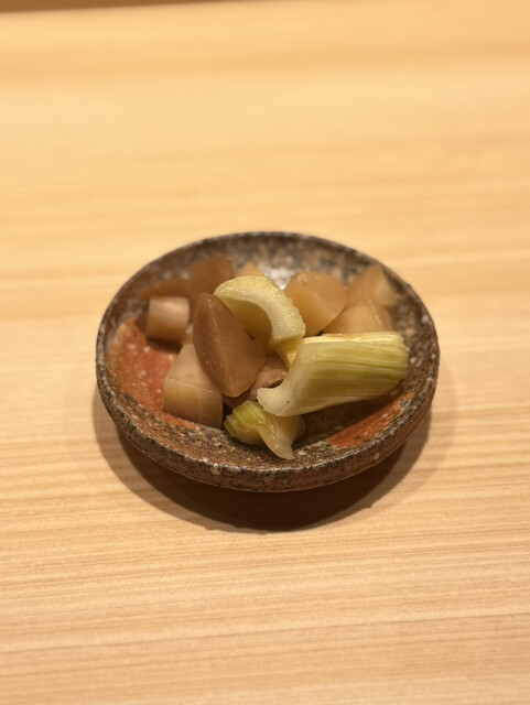 甘鯛の鱗焼きには、菜の花のカラシ醤油と出汁醤油が添えられていた。フレンチではよく見かけるが、和食店では珍しい調理法で、しかも火入れの難易度が高い。この仕上がりを見る限り、限られた機材と時間の中で、職人がいかに工夫しているかが伝わってくる。鱗はパリパリに焼かれ、香ばしさが際立つが、身の旨みも決して負けていない。