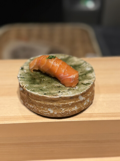 店内は全体的に照明が落とされ、静かで落ち着いた空間が広がる。しかし、カウンターと調理場には明るい光が当たり、職人の所作がはっきりと浮かび上がる。そのコントラストが絶妙で、料理への期待を一層高める。さらに、カウンターに置かれた盆栽がまた見事で、不完全さの中に美を見出す侘び寂びの精神を体現している。