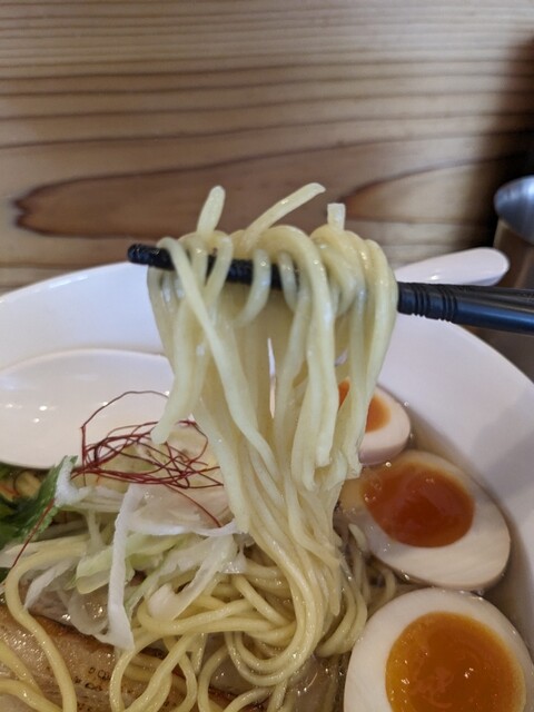 細麺のストレート麺で、スープが包み込みます。