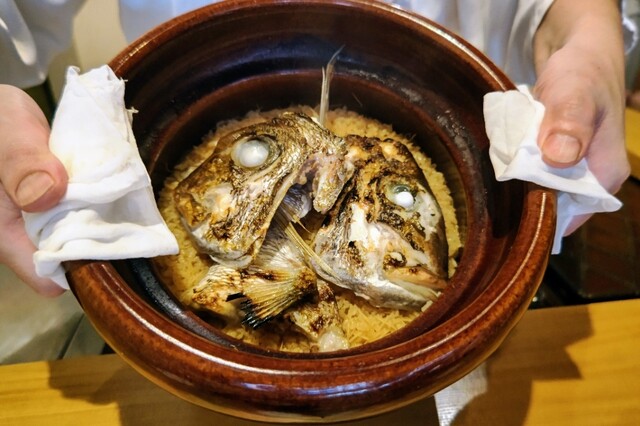 等を食べながら、マトウダイ、〆鯖、小鰭、蟹と流れて、釜飯〆へと向います。
