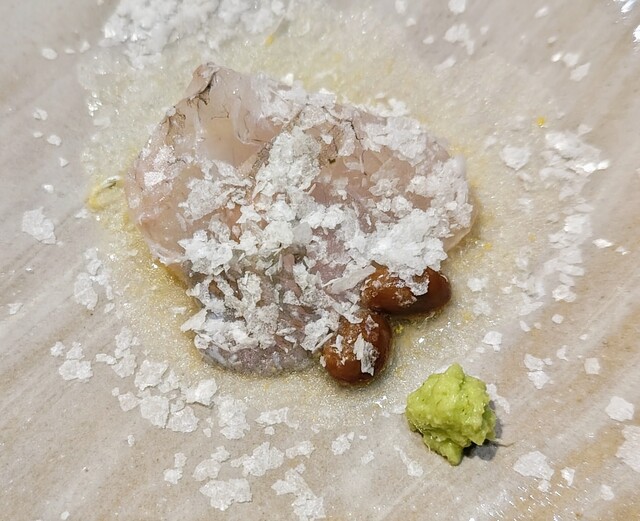 次にやってきたのは、鱈の白子とラ・フランス、胡桃、薩摩芋を和え。これも激旨❗添えてある芝海老も良いっすね。