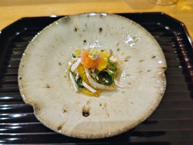 お店はコンクリート打ちっぱなしと漆喰でとても落ち着いた雰囲気があり、かつ、4人掛けテーブル席とカウンター5席のみという小ぢんまりしているものの、広さは十二分にあるゆとりある空間であるほか、ランチタイムは一組しか受け付けていないということのようで、ご主人の会席料理を独り占め(一組占め)という素晴らしい2時間のお昼コース(会席料理)を頂くこととなりました。