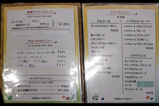 がメインで、前菜、スープ、パンORライス、デザート、珈琲orティーが付いて1,800円となっていました。