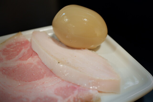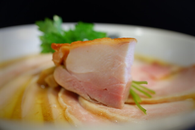 この鶏ももチャーシューは、凝縮した旨味とジューシーなレア感を楽しむ事ができる味わい。