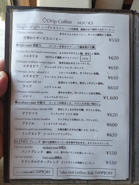 好みは深煎りだが、たまには浅煎りも味わってみようと日替わりサービスコーヒーをチョイス。