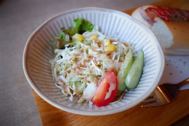 Cモーニングは田原ポークのソーセージを使った、ハーフサイズのホットドッグとサラダ。